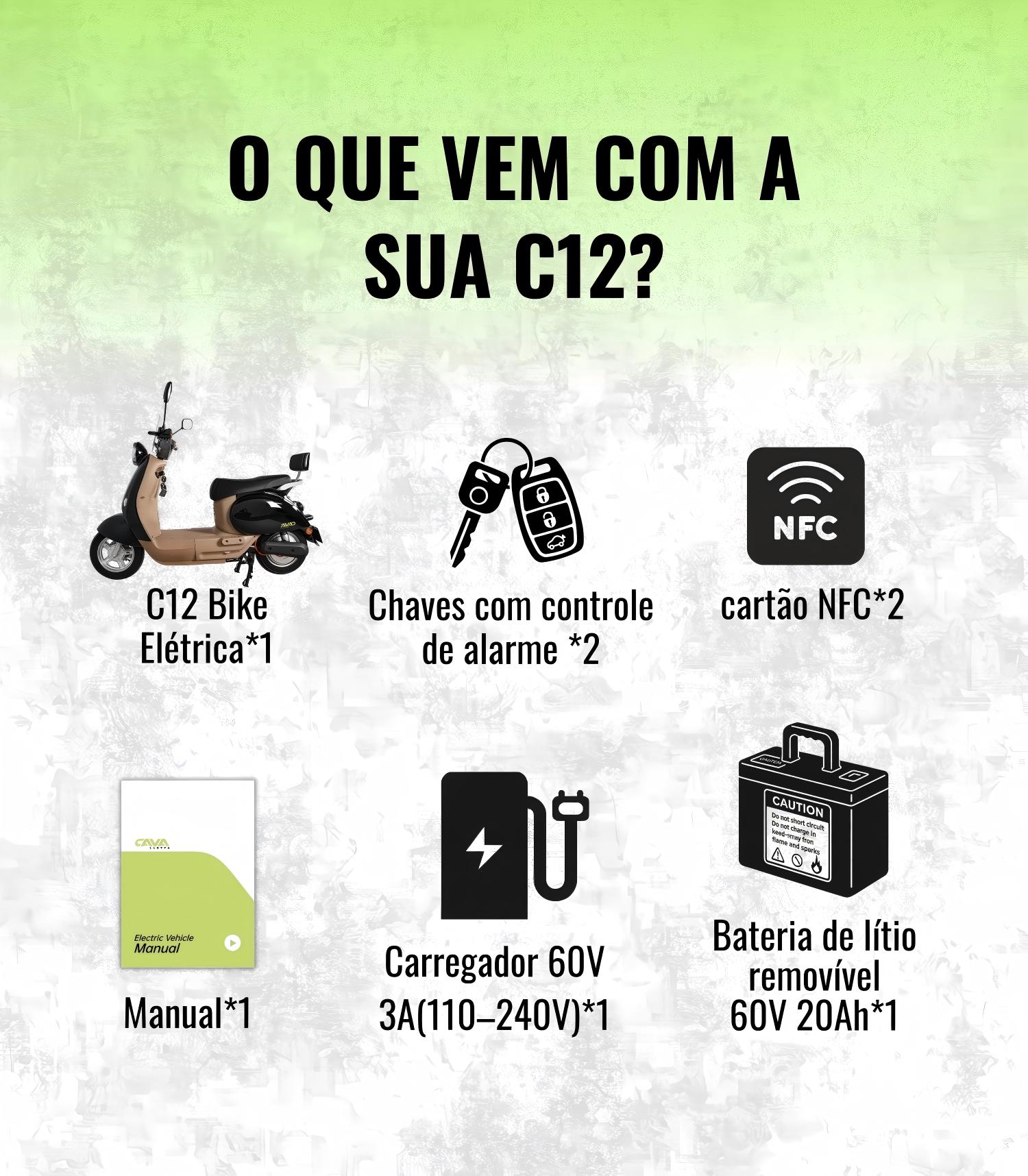Quando a rotina exige carregar mais peso, encarar ladeiras longas e manter alta confiabilidade todos os dias, a C12 entrega com folga. Com sistema elétrico de 60V e bateria LFP, potência de 1000W e freios a disco, ela foi pensada para quem busca estabilidade, segurança e custos menores no longo prazo – em casa ou no trabalho.