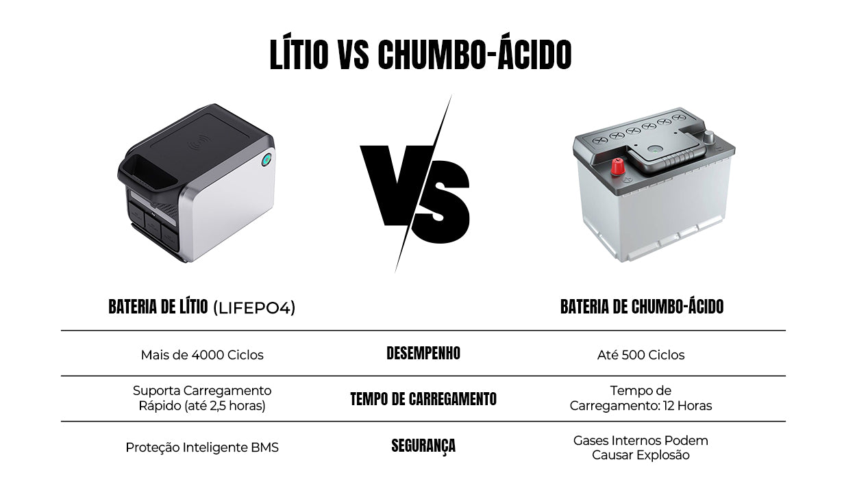 A bateria de lítio oferece maior vida útil, carregamento mais rápido e melhor eficiência energética quando comparada às baterias tradicionais de chumbo-ácido.