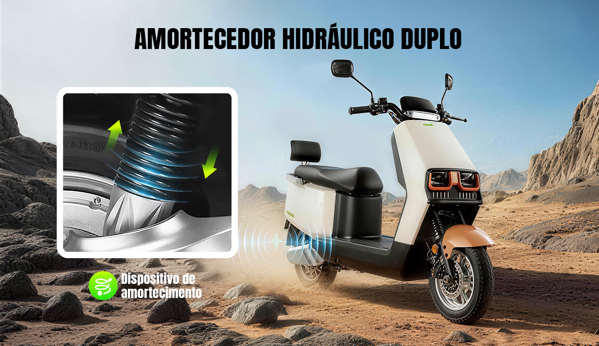 O sistema de suspensão com amortecedores hidráulicos duplos absorve impactos com eficiência, proporcionando uma condução mais suave mesmo em ruas irregulares.
